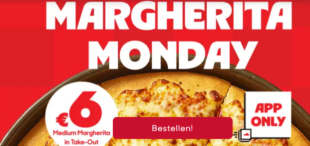 De week begint meteen goed! Elke maandag scoor je een medium Margherita pizza voor slechts €6 in take-out — enkel via de app. Klassiek, lekker en betaalbaar. Precies wat je nodig hebt om die maandagochtendmoeheid weg te spoelen. Jij weet toch ook dat pizza hét ultieme comfortfood is?