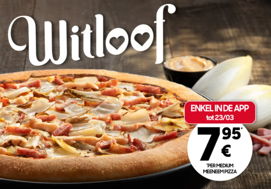 Heb jij al de Witloof Pizza geprobeerd? Voor €7,95 via de app geniet je van een typisch Belgische twist op de klassieke pizza. Witloof — of chicon als je wil — op een knapperige bodem: het klinkt verrassend, maar het is gewoonweg heerlijk. Een must-try voor de echte foodie in jou!